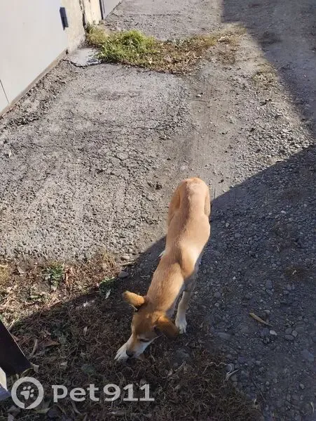 Большая,жёлтого цвета,порода может бульдог я не разбираюсь,с ошейником, лежит на одном месте будто ждёт когото очень спокойная видно дрессированная.Голодная ест хлеб. Видели уже второй день.Сней ещё одна собака поменьше фото смотреть.