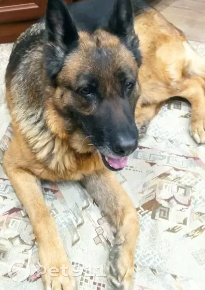 Немецкая овчарка среднего размера. Возраст 7 лет. Дружелюбная к людям.