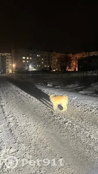 Крупная собака. По породе похожа на акиту. Пыталась поймать, не идет, убегает. Голодная. С черным ошейником.