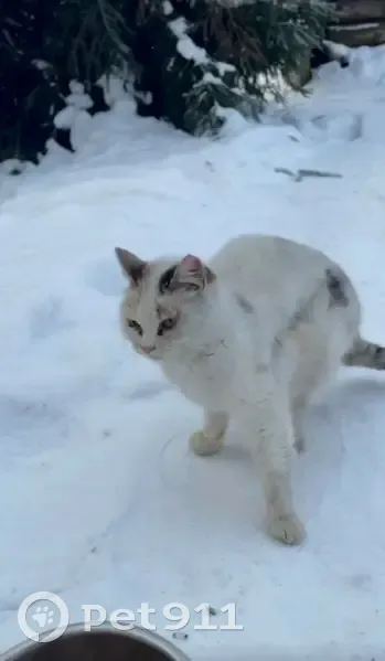 Трехцветная кошечка, в основном цвет белый, хвост трехцветный. Пришла ко мне на участок на крыльцо. Видно, что кошечка была домашняя, но боится подпускать к себе близко. Видимо потерялась недавно , сильно не истощена.