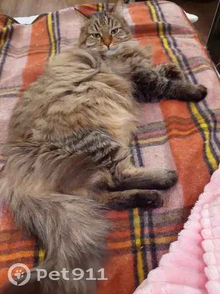 Крупный серый кот (окрас трехцветный), в меру пушистый, с длинной шерстью. Глаза круглые, взгляд детский. Круглые щеки, усы белые, подушечки лап черные. Глаза желто-зеленые. Кот домашний, на улице толком никогда не был, пугливый. ВОЗНАГРАЖДЕНИЕ ГАРАНТИРУЕТСЯ