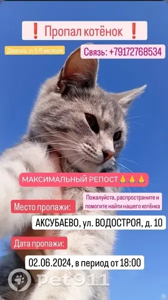 Пропал котенок! 🐈😭 Всем привет. У нас пропал котёнок, 02.06.24 сел в машину к родственникам, приехал с ними до их дома и убежал. Пожалуйста, помогите распространить 🙏 Имя: Миссис Паф (знаю, необычное, возможно и смешное, но мне нравится) Цвет: серый Пол: девочка Возраст: 5-6 месяцев Место пропажи: АКСУБАЕВО, УЛ. ВОДОСТРОЯ, Д.10 Дата пропажи: 02.06.2024, под вечер, в период от 18:00. Котёнок очень пугливый, но ласковый. Откликается на своё имя. Мы очень переживаем! 😭 Если вы видели нашего котенка, пожалуйста, сообщите нам! Контакты: 79172768534 Помогите нам вернуть котенка домой! 🙏 Поделитесь этим объявлением, чтобы увеличить шансы на его возвращение! В конце есть фото для репоста🙏 #пропал #котенок #потерялся #помогите #найти #кошка #питомец #животное
