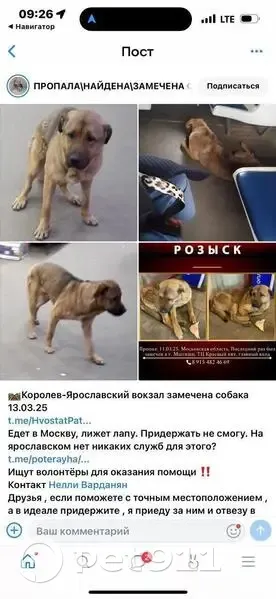 Пёс средне-крупный, спокойный, хромает на переднюю лапу, лижет ее. Уехал 13.03.25 на электричке из Мытищ в Москву, а оттуда в Александров на электричке в 8.06. Ищем на станции Александров. Мог также опять уехать обратно в Москву. Помогите найти!
