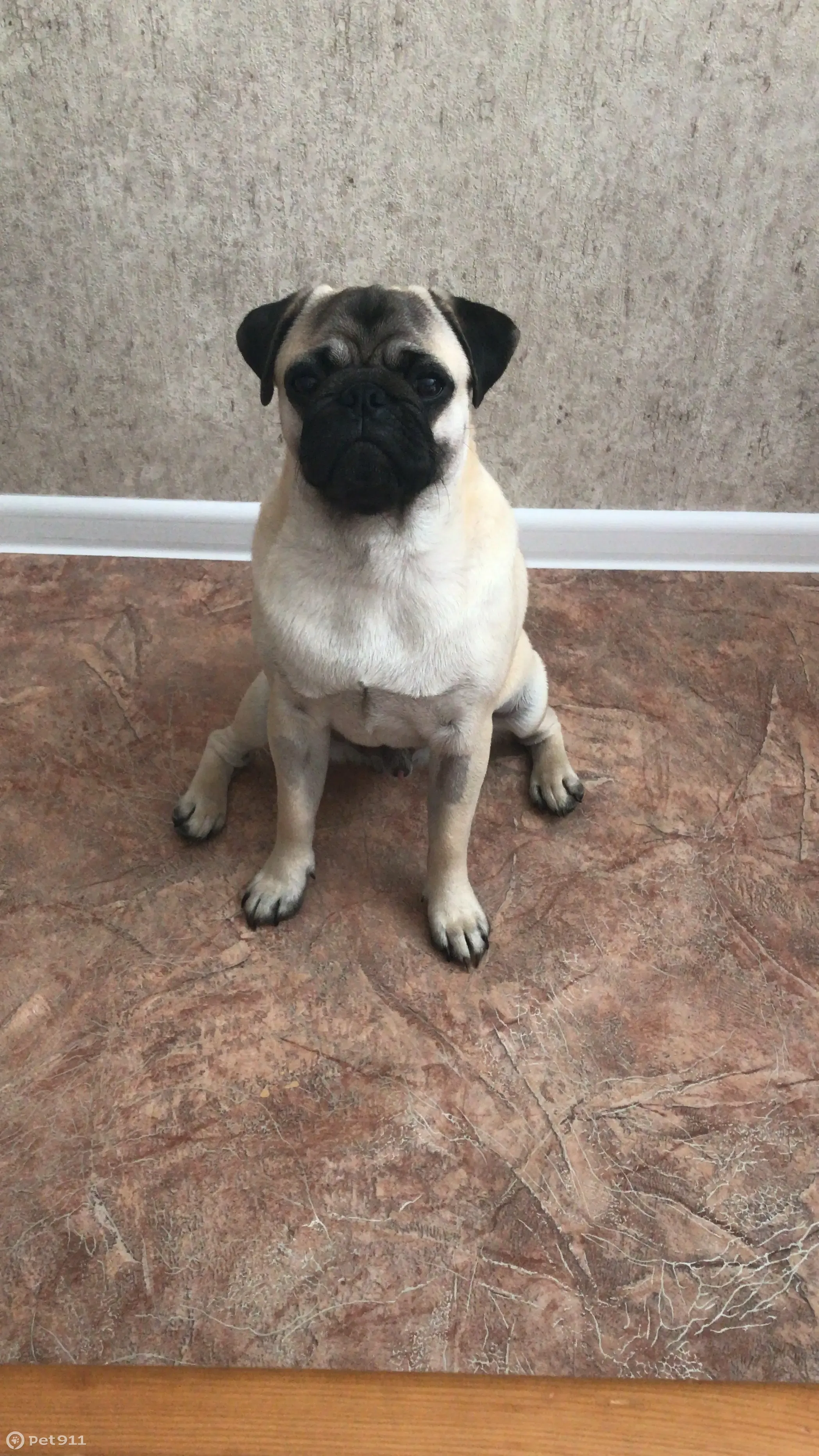 Мальчик, мопс, бежевого окраса, тетя пошла в магазин, а когда вышла его не было, мы сами не из деревни, приехали в гости и собака ничего здесь незнаек, он пугливый, от страха гавкает