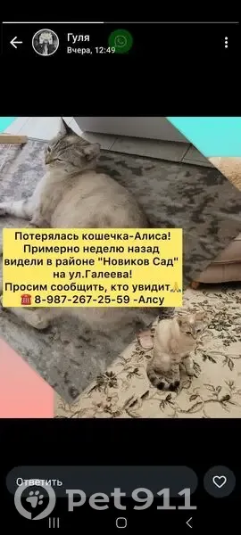 Потерялась кошечка Алиса. Похожа на сиамскую, светлая, хвостик тёмный полосатый, очень ласковая, любвиобильная. Алиса (она из Казани), но к сожалению потерялась в городе Альметьевск, около садика Алсу, (на Галеева 18, ЖК Новиков сад) её видели неделю назад. На улице наступили холода. Помогите домашней кошечке вернуться домой. Если встретите, придержите кошечку и сразу позвоните, её приедут и заберут на передержку до приезда хозяйки: 89872672559 Алсу 89872615905 Гульфия