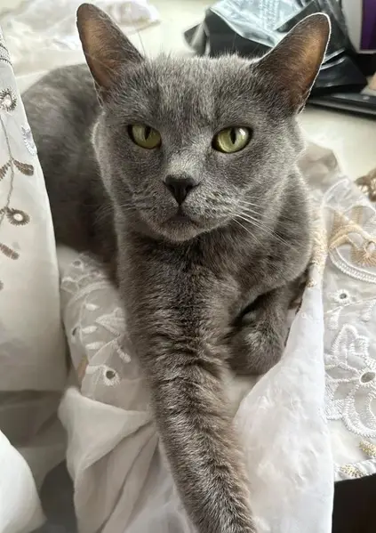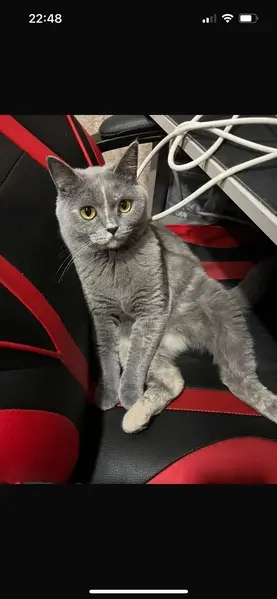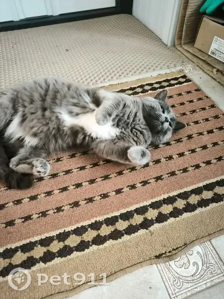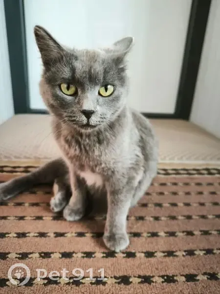 Окрас голубой, похожа на британскую, молодая кошечка, ещё котёнок, была сломана задняя ножка и неправильно срослась, не наступает на неё, очень ласковая подходит к людям, ее подкармливают местные жители посёлка Лесной, по улице Радужная