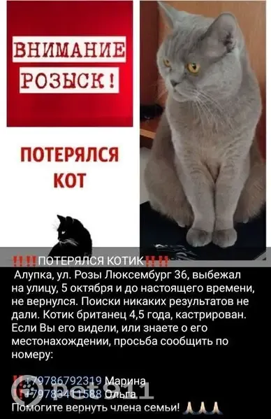 Объединено с объявлением rl1083098. Причина-дублирование информации. Описание дублирующего объявления: Британский, серый ,глаза большие жолтые. Кот взрослый. Если кто-то увидит, пожалуйста придержать его и сразу позвоните +79786792319