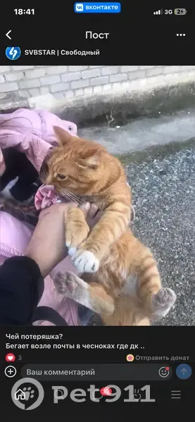 рыжий кот с белыми участками, на лбу есть буква «М» глаза будто подведены чёрным. Кот проживал в п.Дубовке, есть вариант что его увезли. 20.10.2025 его видели в чесноках, приехали на место, но так и не смогли найти.