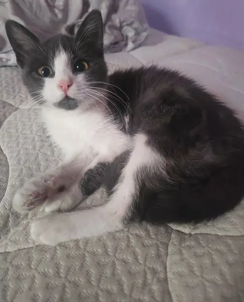 Пропала в районе 4 школы г.Анапа, серая ,с белыми лапками и грудкой, зовут Мася, на улице не была раньше,могла забится в подвале от страха