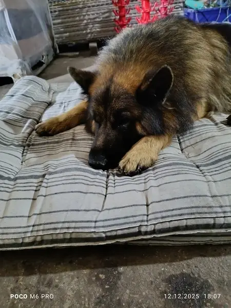 Немецкая овчарка, откликается на кличку Рэй, длинношорстная, окраска: чёрный с подпалинной.