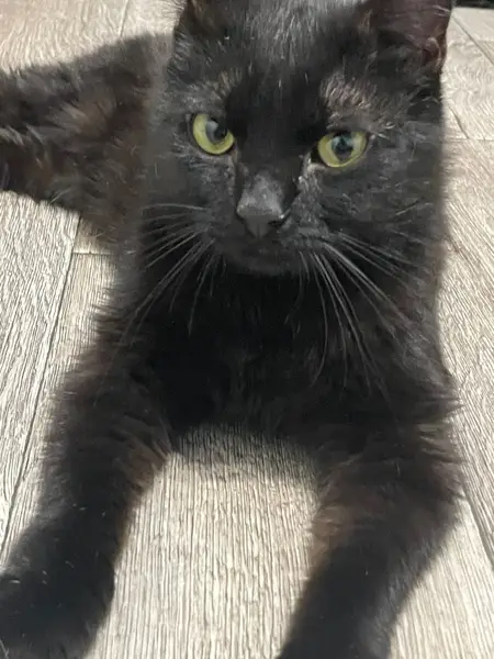 Черный окрас, большие ярко-желтые глаза, порода собак шотландский вислоухий.