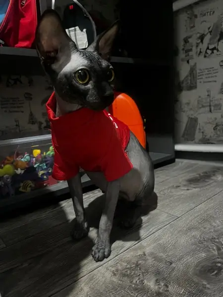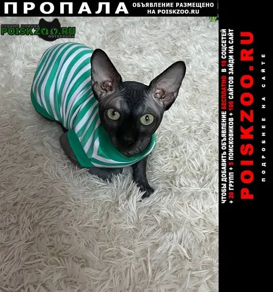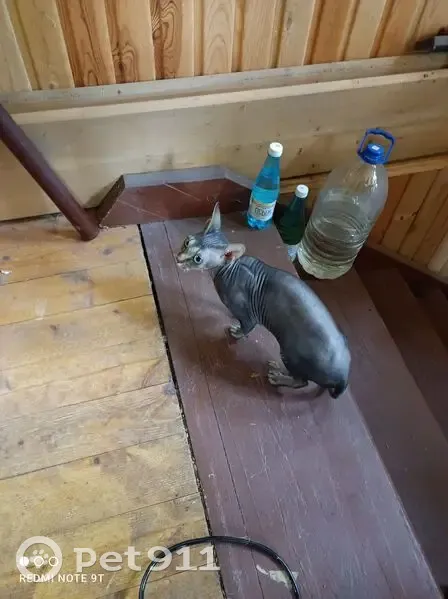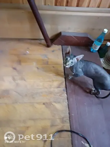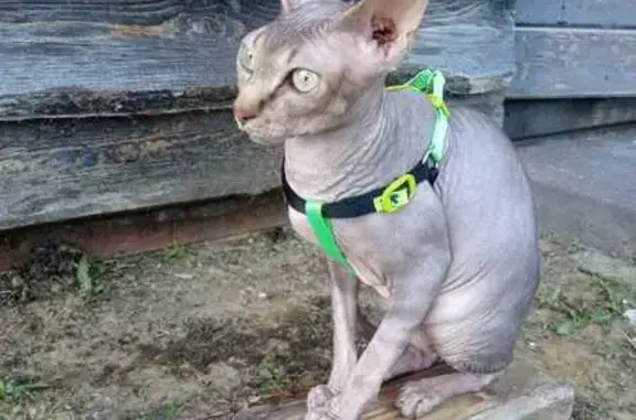 Серая кошка, девочка, сфинкс, лысая, маленькая, возраст примерно от года до двух, глаза светло зеленые, ласковая. Пришла к нам на участок. Была голодная.