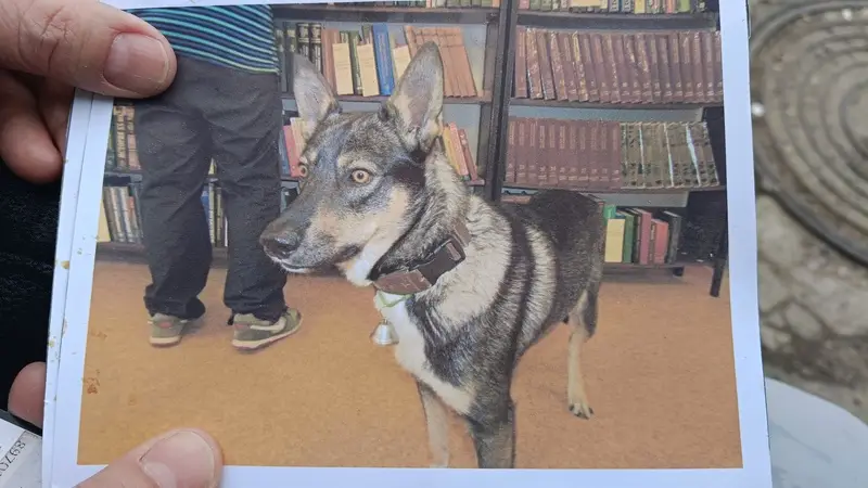 Похож на лайку, - хвост бубликом. Окрас коричнево-серый. Имеется кожаный черный ошейник. Прекрасно ориентируется в лесу, но не ориентируется в городе. Комфортно чувствует себя в машине.