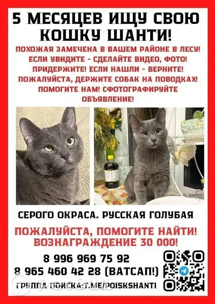 Пожалуйста , помогите найти Шанти! Окрас серый однотонный, фенотип русская голубая, 2 года, стерилизована. Есть особая примета - внутри глаза виден кровеносный сосуд. Шанти очень ждут дома