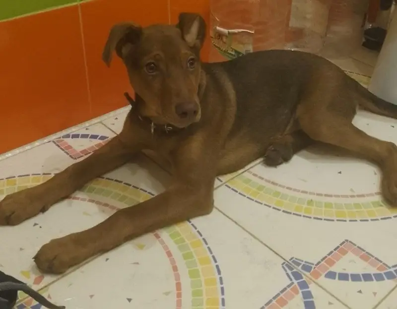 Пёс, мальчик, полу Стафор, полу дворняга, окрас тигровый с белым пятном на груди. 19.10.24 выбежал из двора, по видео с камеры выяснилось что он побежал за подростком который двигался по ул.Серова в сторону ул.Пушкина.