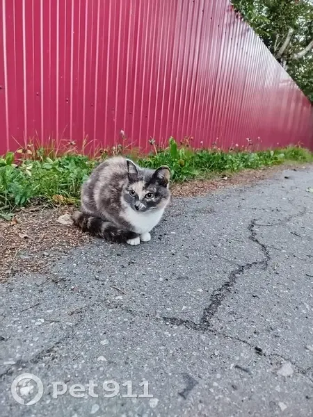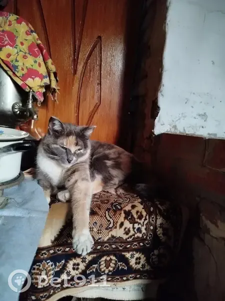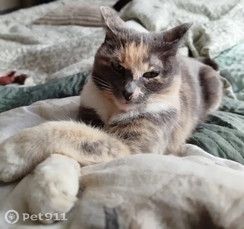Трехцветная кошка, худая, немного загибаются ушки. Она на самовыгуле, гуляет вместе с нами и с собакой, иногда уходит не надолго погулять отдельно, а в этот раз ушла и не вернулась, кошка старенькая, но выглядит очень молодо, возможно деменция, забывает место жительства