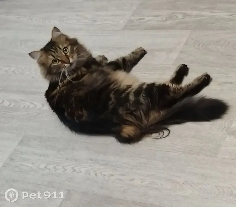 Окрас :окрас темно коричневый ,спина темная ,местами полосатый ,пушистый хвост,передние когти удалены,кастрирован,домашний,очень боится незнакомых мест и людей.Выбежал из квартиры пока дверь была открыта или выпал с балкона второго этажа точно неизвестно