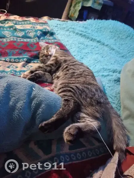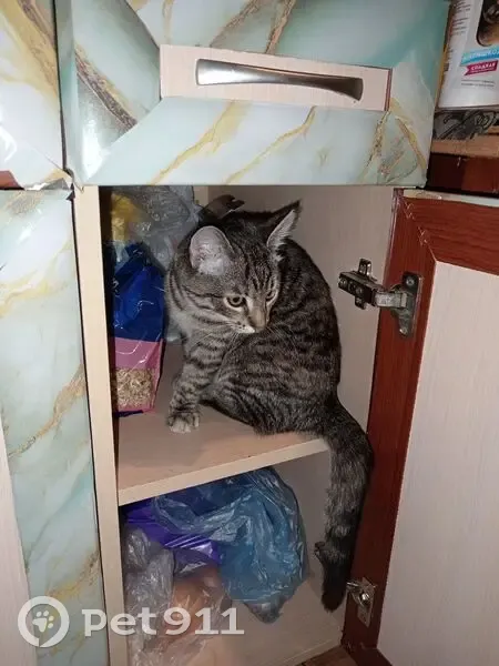 Молодая полосатая кошка. Без явных белых пятен. Котенку 4-5 месяцев, убежала в открытую дверь когда я выставляла магнитофон в подъезд. Заметила пропажу только через час, за это время она испугалась соседей и выбежала на улицу. Из явных отличий от других кошек такого окраса черное выразительное пятнышко на нижней губе. Обычно отзывается на имя и бежит крича, но самостоятельно мне найти ее не удается.