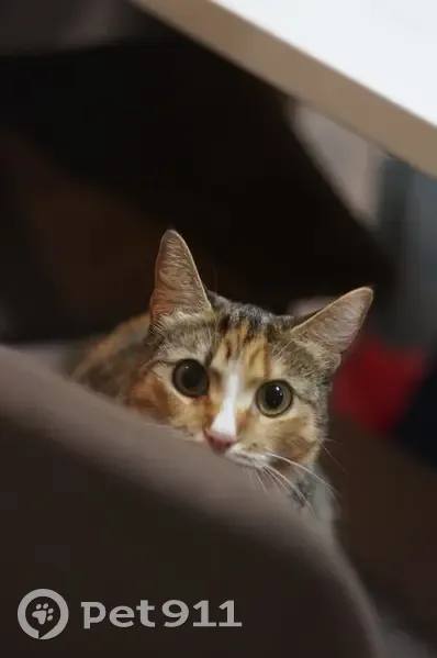 Выбежала из салона на проспекте Новгородский, игривая, возможно увидела крысу или птицу. Полосатая с рыжим пятном на носу и на спине, кончик хвоста белый.