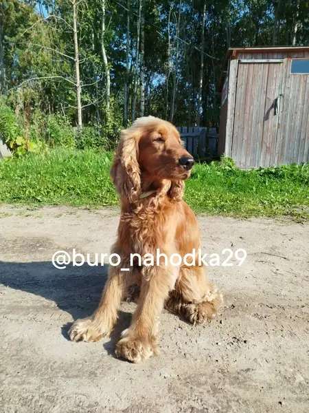 Кокер спаниель, ярко рыжий, есть едва заметное белое пятнышко на шерсти у носа(на фото можно разглядеть), в ошейнике с подвеской в виде синей косточки(имя Изюм и номер телефона)
