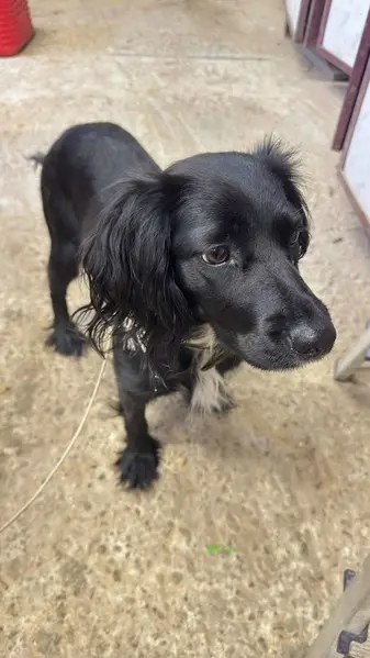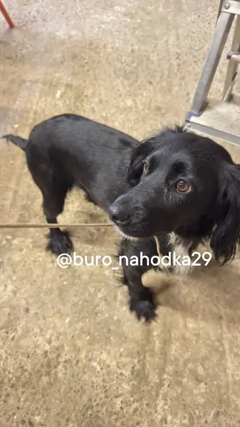 Русский спаниель, помесь, ушы обвислые, черный белый крест на груди. 6 апреля убежал от дома по ул. Ударников 8. Пес 1 год., хвост колесом.