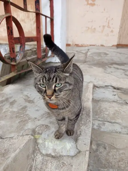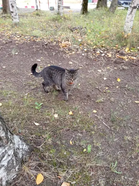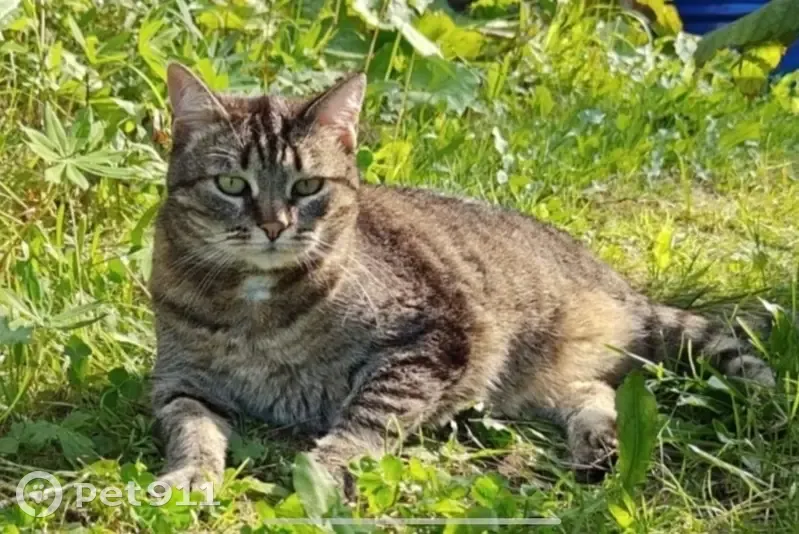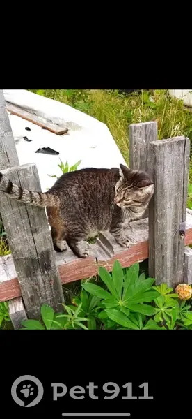 Взрослая кошечка,серо-рыжий окрас с черными полосами,пухлый свисающий животик,короткие лапки похожие как у тигрёнка. Очень пугливая,на руки и гладить не даётся