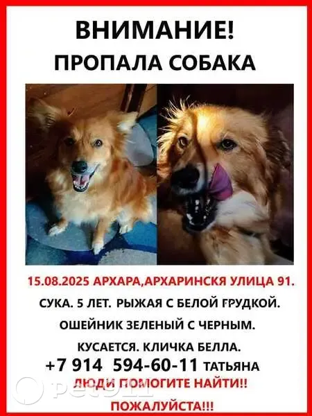 Собака рыжего цвета есть и белый, на ней был зелёный ошейник, уши не стоячие пропала ночью она ушла куда-то и больше не вернулась, кличка Белла Надеюсь вернётся.