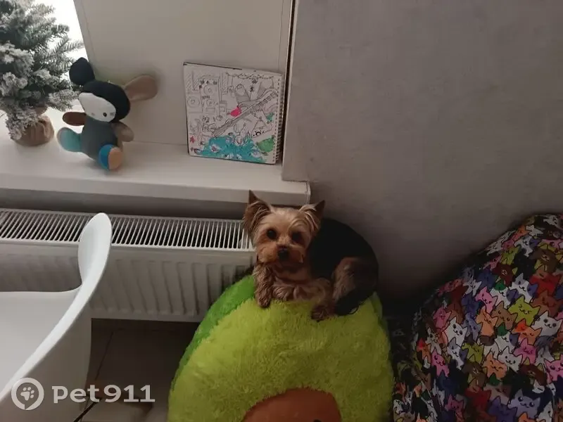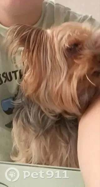 Йорширский террьер, чёрная спина, стоячие уши, светло-шерстный. Шерсть приблизительно средней длины. Особые приметы:пожилой, осталось несколько зубов, в районе таза на внутренней стороне бедра в районе таза татуировка с числами. Любит сидеть на руках.