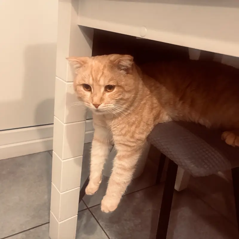 Гулял около дома,окрас персиковый рыжие глаза,уши чуть висят,очень осторожный