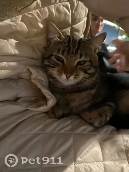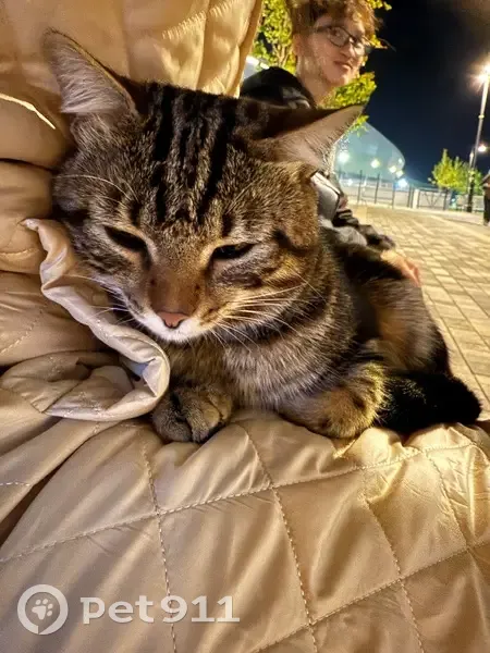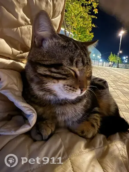 Очень милый дружелюбный котик, сидит на скамейке и грустит, выглядит домашним и как будто потерялся, ему холодно, забрать к сожалению не смогли (