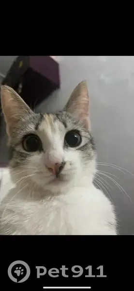 Мальчик 9 месяцев. Трёхцветный: белый, серый, персиковый. Ошейника нету. На лапках пальчики розовые. Очень пугливый на улице. Любит колбасу, когда чешут горло, любит кусаться, бегать, лежать таким образом на коленях