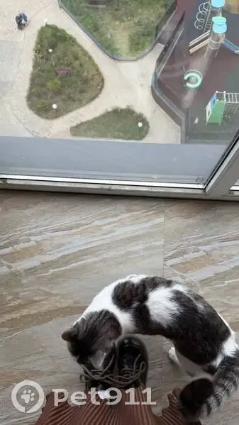 Белый, с темно-серыми пятнами в полоску. Cосед вынес из подъезда ЖК Эмир и по его словам оставил у ЖК Анисы