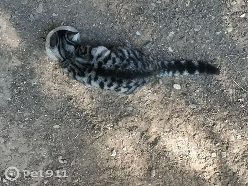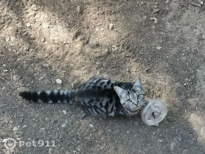 Кошечка появилась около нашего дома в пятницу или субботу, на выходных. Явно домашняя, чистенькая, красивая. К людям идёт, других животных боится. Похожа на шотландскую прямоухую короткошерстную. Окрас серый с темными полосами, мордочка светлее. Глаза круглые, сама мордочка тоже круглая. Лапы большие. Достаточно пушистая. Кажется гораздо крупней и тяжелей, чем есть на самом деле. Очень лёгкая.