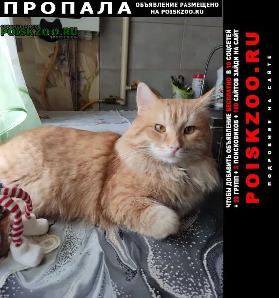 Рыжий окрас, пушистый, на вид года 2-3, с ошейником, не кастрирован. Сидел у магазина "Магнит".