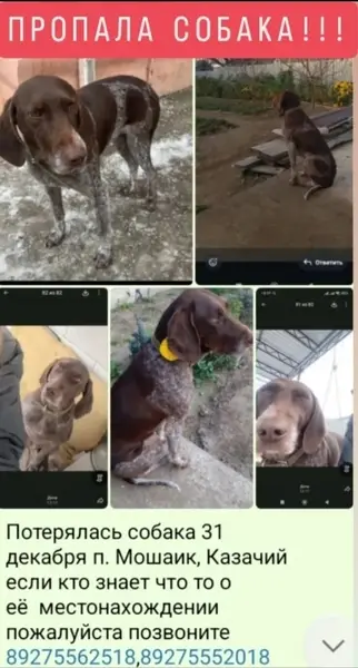 Найдена в Камызякском районе. Девочка, на вид 2-3 года. Очень умная, знает команды и машину. Видно, что собачка "рабочая" охотничья. Ищем потерявшего хозяина, либо в новые хорошие, охотничьи руки, так как держать у себя долго не сможем. Звонить 8988-1430384, 8927-072-0336, 8917-182-2571