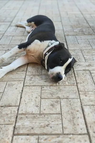 Порода бойцовская, окрас серо-чёрный с белыми пятнами,