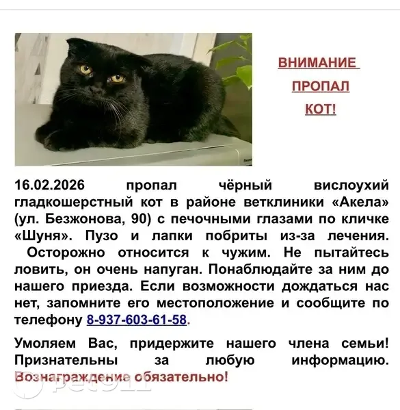 Пропал чёрный вислоухий гладкошерстный кот с песочными глазами в районе ветклиники «Акела» (ул.Безжонова,90).Пузо и лапки побриты из-за лечения. Отзывается на кличку «Шуня».
