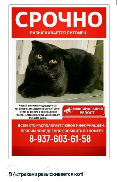 Pet911.ruАстраханьПропавшиеКошкиПропал кот, улица Безженова, 90, Астрахань - чёрный вислоухий с песочными глазами