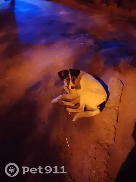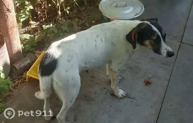 На ухе красная клипса, собака не большая, до колена, в основном белая с пятнышками, мордочка рыже черная, на хвосте черное пятно!Собака очень добрая, ласковая, контактная. Видели в районе АЦКК, может быть и в 6-м микрорайоне