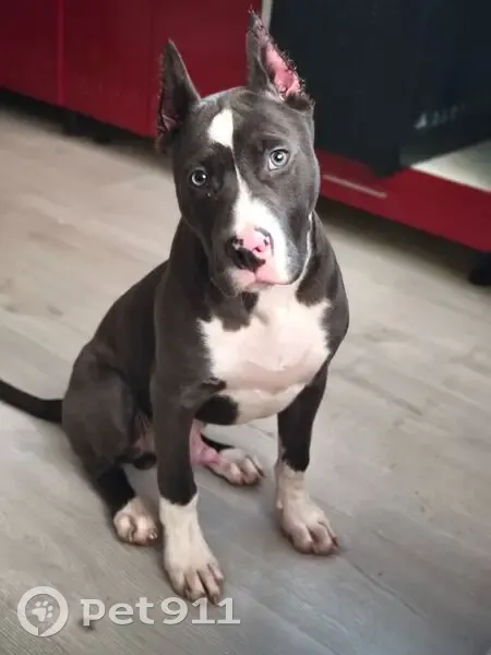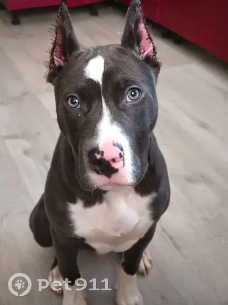 Голубой окрас, зовут Майк, собака приветливая, купировали недавно уши, швы на ушах остались не сняли нитки, бегал без ошейника, зади на хребте пятно белое
