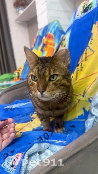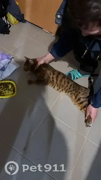 В поисках своего бенгальского котика, мы нашли другого бенгала. Кот некастрирован, был в сером ошейнике, левое ухо завернуто. Возможно долго бродит, в чатах по поиску наткнулась на объявление с котом с такими же приметами, что он бродил с начала лета в районе Бекасово. Может это были разные коты, но у обоих загнуто ухо и очень похож раскрас. Сейчас кот находится дома в безопасности