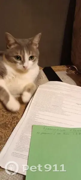 Спинка серая, живот и лапки белые, половина носика серая, половина розовая, шерсть плотная, гладкая. Вырвался из шлейки во время прогулки, домашний, улицу не знает, боязливый.