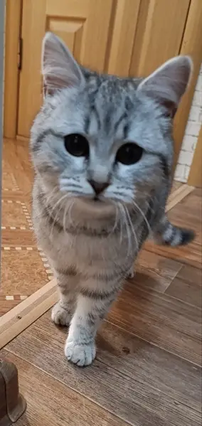 Серенький кот. Полосатый. Зеленые глаза, вислоухий. Очень пугливый Отзывается на кличку Персик.