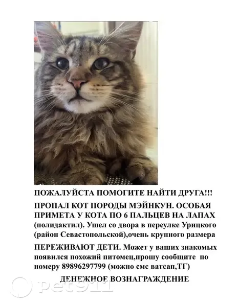 Мейнкун.Вышел гулять и не вернулся. Енотовидного окраса, крупный кот, не кастрирован. Особая примета - передние лапы по 6 пальцев , (полидакт- особенность породы) За достоверную информацию вознаграждение! Обратите пожалуйста внимание , может быть у ваших соседей, знакомых появился похожий питомец