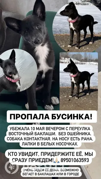 Пропала дворняшка, девочка, около 6-7 месяцев, окрас черный, грудка белая, Лапки в белых носочках, на носу рана, хвостик чуть искривлен, на кончике хвоста белое пятнышко, лапки длинные. Собака вышла за ограду и дети местные позвали не с собой и она не вернулась домой.