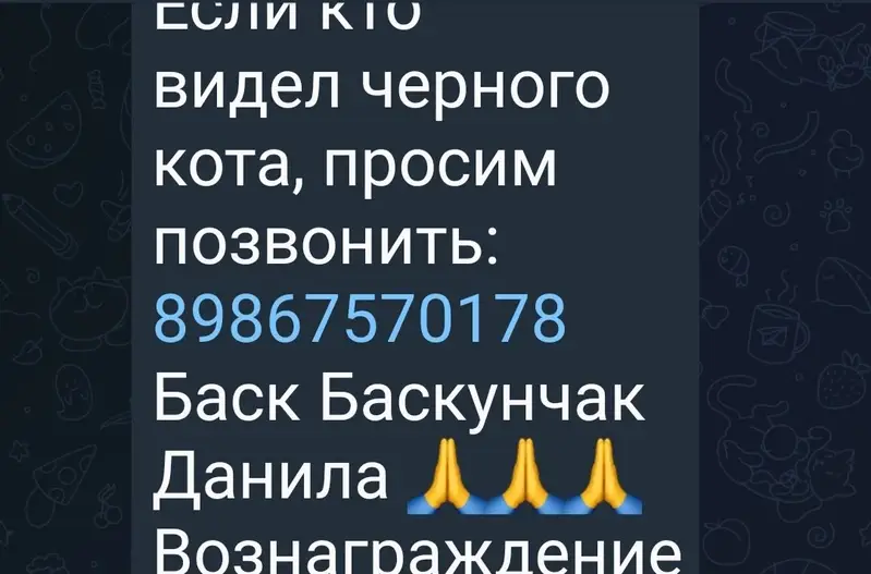 Вчера вечером на ул. Ленина около многоэтажек найден маленький черный котенок. Может хозяева его ищут, так как котик чистенький ,ухоженный, на вид месяца два,может меньше. Хозяева или кому нужен котик звоните оставить у себя не могу маленький ребенок и свой кот есть.
