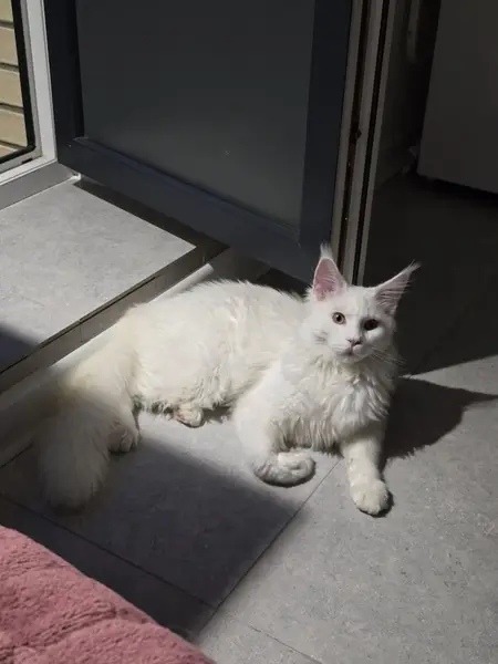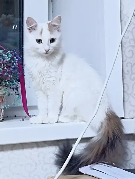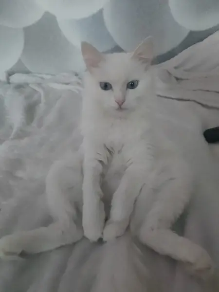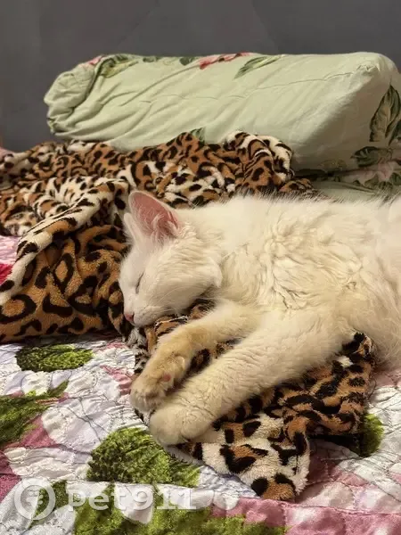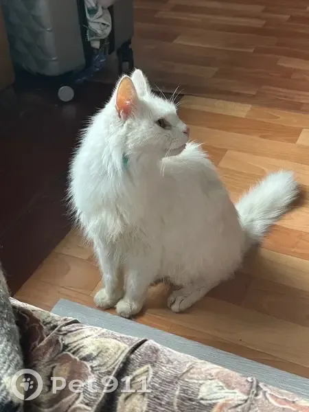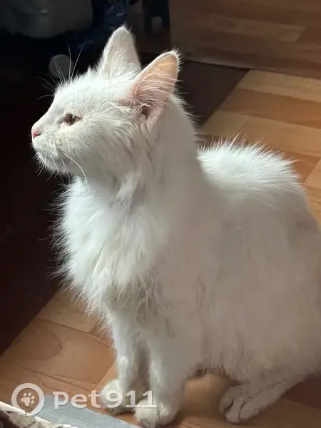 Белая кошка, похожа на Ангору, высокая, очень ласковая, но очень худая, видимо давно на улице Нет верхнего зуба Поранена нижняя губа