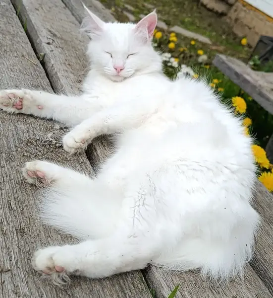 Очень ласковая полностью белая кошечка / кот с длинной шерстью. Похожа на турецкую ангору. Сидела у подъезда и громко мяукала.