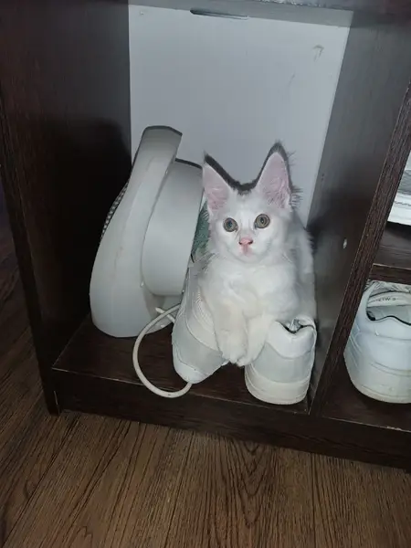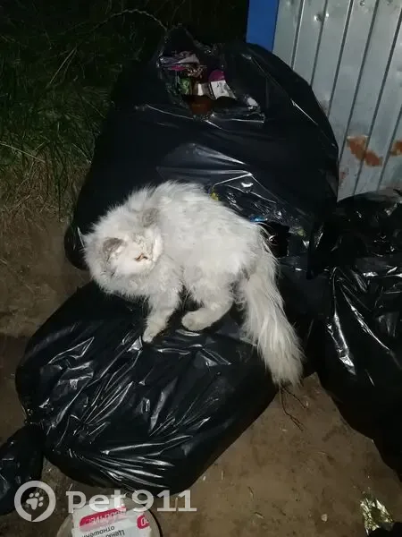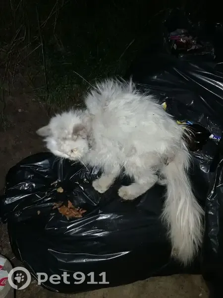 Котик светло-серого цвета. Пушистый, весь в колтунах. Людей не боится. Голодный.