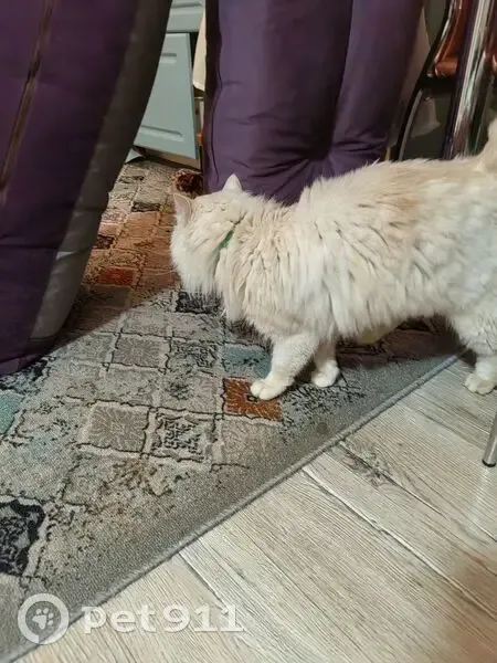Окрас нежно персиковый с белым, шерсть длинная пушистая. Какая то порода. Ошейник зеленый. Мальчик, наверное молоденький. Ласковый, идет на контакт. Прибился котик к нам во двор.